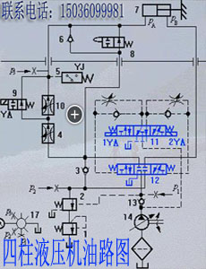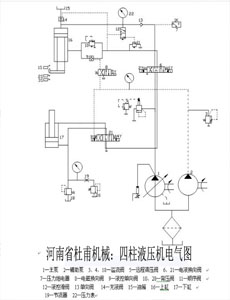 四柱液壓機由主機及控制機構(gòu)兩大部分組成。液壓機主機部分包括液壓缸、 橫梁、立柱及充液裝置等。動力機構(gòu)由油箱、高壓泵、控制系統(tǒng)、電動機、壓力 閥、方向閥等組成。