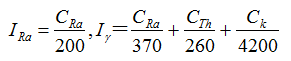 式中 CRa、CTh、CK——建筑材料產(chǎn)品中,226Ra、232Th、40K的放射性比活度,Bq?kg-1;